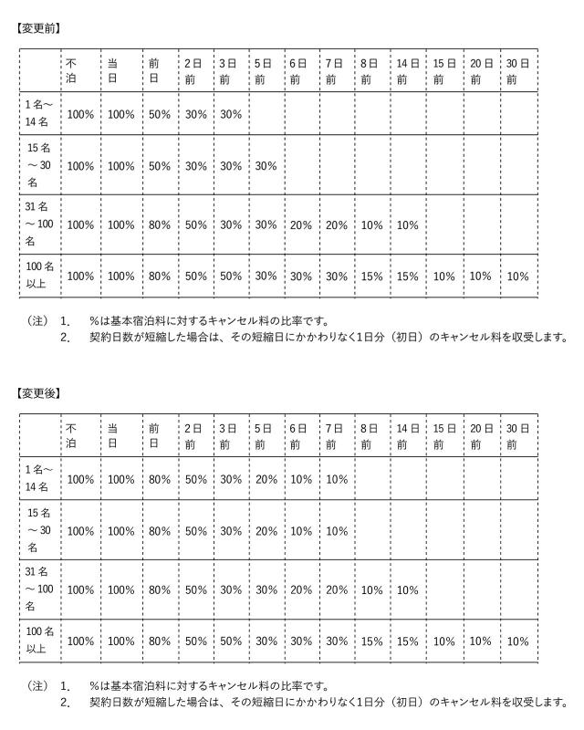 記事一覧へ宿泊約款、一部キャンセルポリシーの変更について2024年08月19日日頃より、游泉志だてをご利用頂き、誠にありがとうございます。 宿泊約款について、条文の一部変更とキャンセルポリシーの変更をお知らせ致します。 キャンセルポリシーに関しましては、宿泊日に関わらず、2024年9月1日(日)以降のご予約分から適用となります。 キャンセルポリシーの変更後の内容は以下の通りです。 ご理解頂きますよう、お願い申し上げます 前へ次へ